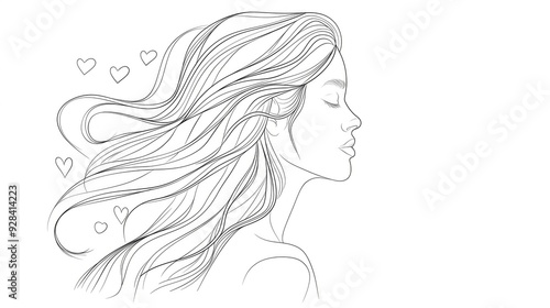 Elegant line art of a serene woman with flowing hair and hearts, representing love, peace, and tranquility
