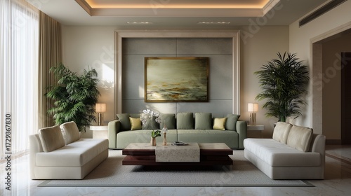 Elegant Living Room: Experience the perfect harmony of space and serenity, with a light-filled, luxuriously decorated living room designed for comfort.