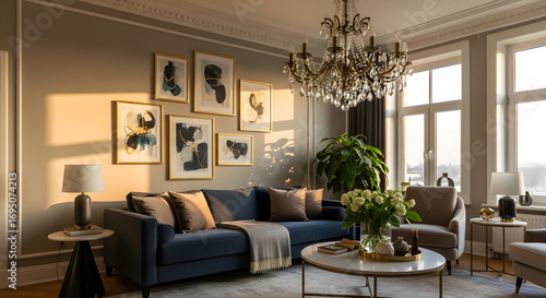 Elegant living room interior showcasing modern design, art, and cozy furnishings