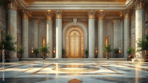 Elegant marble hall with golden doors and plants.