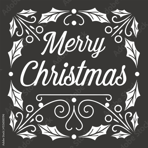 Elegant merry christmas greeting with ornate white holly leaf border on dark background