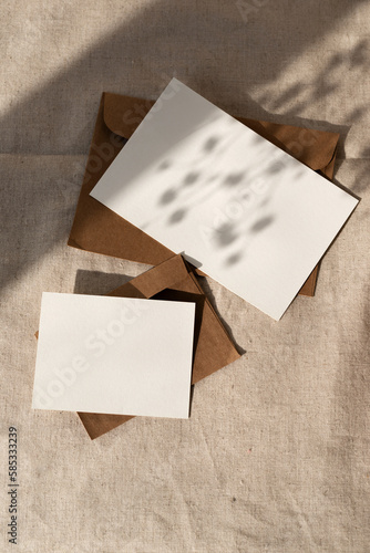 Elegant minimalist business brand template, two empty paper cards and envelopes with floral sunlight shadows on neutral beige textile background, aesthetic mock up, flat lay with copy space