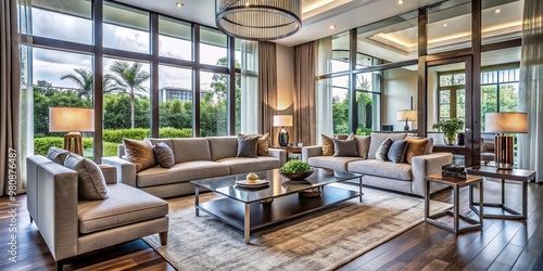 Elegant modern living room with sleek furniture, large windows, and subtle decor, perfect for showcasing a successful
