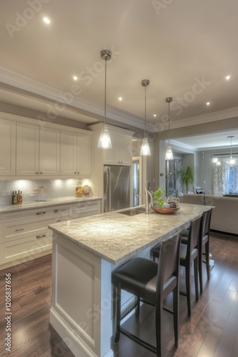Elegant open-concept kitchen design with handleless cabinetry and seamless marble countertop