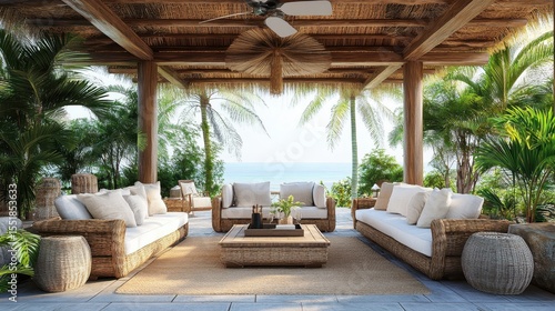 Elegant Outdoor Lounge Area with Comfortable Seating and Tropical View