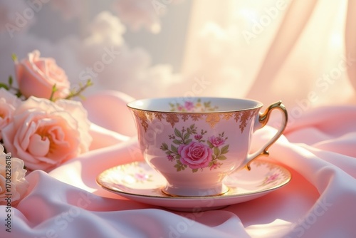 Elegant Pink Rose Teacup and Saucer with Soft Sunlight