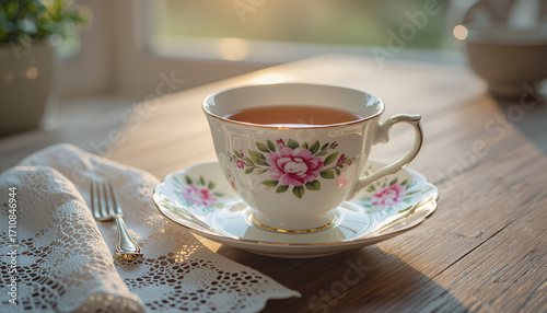 Elegant porcelain teacup on lace napkin against a soft bright background with copy space