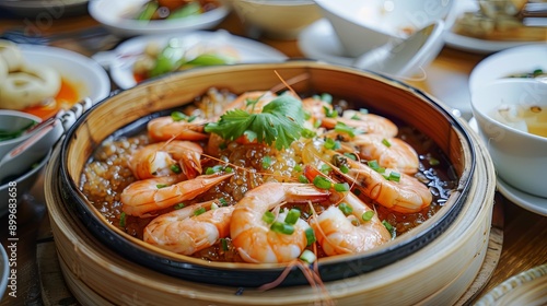 Elegant Presentation of Shrimp with Lobster Sauce on a Wooden Table, Exuding the Aroma of Authentic Chinese Cuisine, Perfect for Gourmet Food Photography