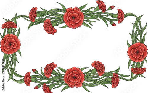 Elegant red carnation floral border with green leaves, perfect for invitations and decorative designs.