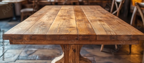 Elegant rustic wooden dining table with blurred interior background ideal for showcasing dining decor and interior design ideas.