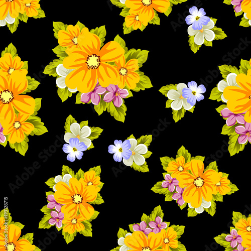 Elegant seamless pattern of flowers on a black background. For the design of cards, invitations, greeting cards, fabrics, banners. For birthday, wedding, party, Valentine's day, holiday.