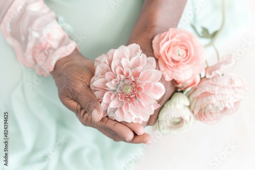 Elegant Senior Black Woman Holding Delicate Flowers: A Symbol of Ageless Beauty in Soft Natural Light