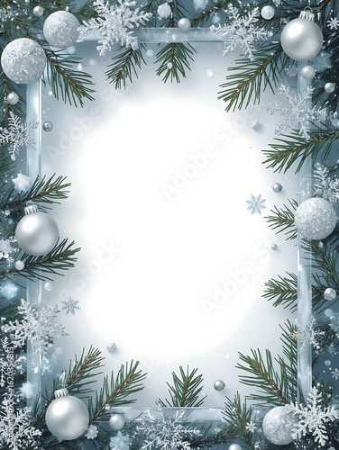 Elegant Silver and Blue Christmas Frame with Snowflakes and Ornaments