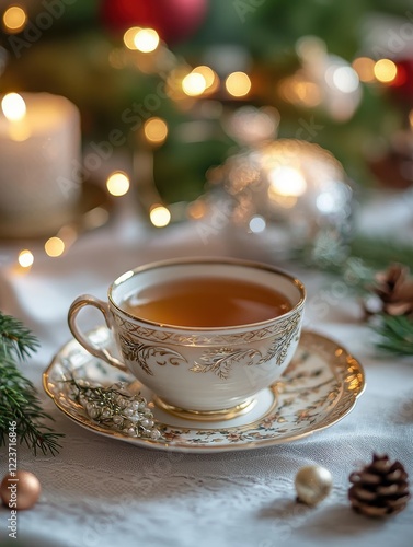 Elegant tea cup on a festive table adorned with candles and holiday decorations during winter celebrations. Generative AI