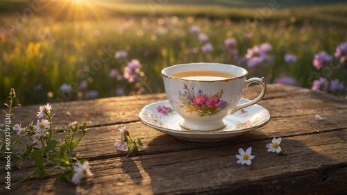 Elegant tea cup on a rustic wooden table surrounded by blooming flowers at sunset in a serene meadow
