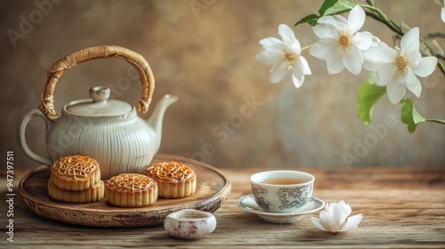 Elegant tea set with mooncakes and flowers on a wooden table, creating a serene and inviting ambiance for relaxation.