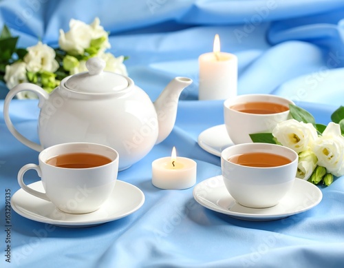 Elegant tea setup with candles and flowers.
