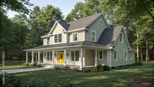 Elegant Two-Story House with Wraparound Porch in a Lush Green Setting