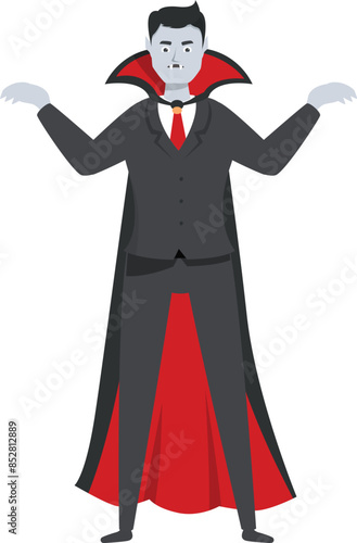 Elegant vampire count wearing suit and cape is spreading his arms, showing his fangs