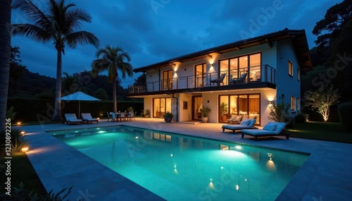 Elegant villa at dusk, inviting pool shimmering under stars, night sky, lighting, calm