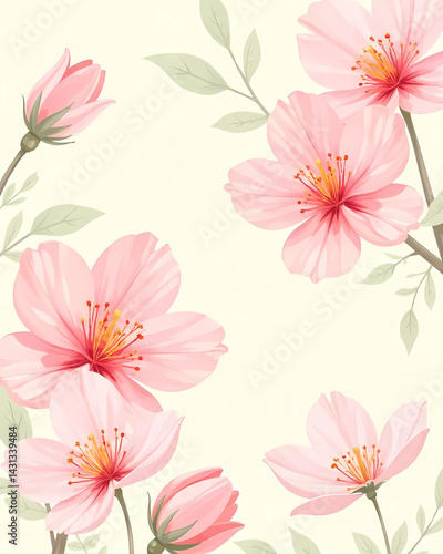 Elegant watercolor illustration of blooming pink cherry blossom (Sakura) flowers with delicate petals and soft green leaves on a pale background. Spring floral design.