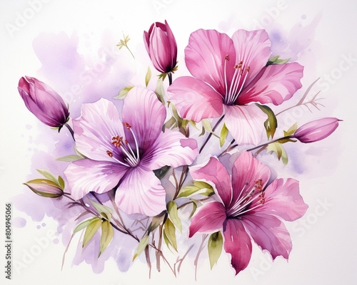 Elegant watercolor of pink and purple flowers, closeup view for a lovely and tranquil wall decor, showcasing nature s spring beauty , high resolution