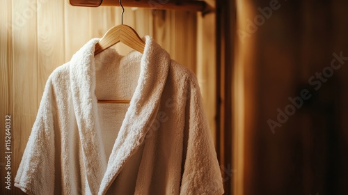 Elegant white bathrobe hanging on a wooden hanger in a luxury hotel wardrobe, showcasing textures and refined ambiance with soft shadows