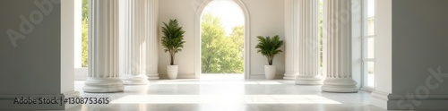 Elegant white columned foyer, bright sunlight , foyer, luxury, simple