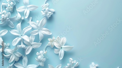 Elegant White Jasmine Flowers on Light Blue Background Minimalist Floral Composition