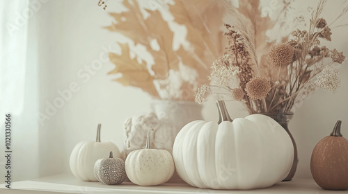 Elegant White Pumpkins on a Soft Beige Background with Autumn Leaves scattered around