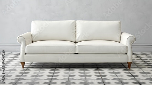 Elegant white sofa with patterned floor and simple background scene