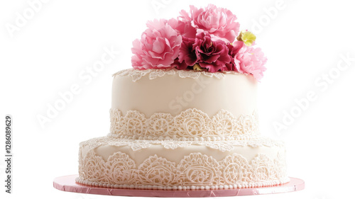 Elegant white wedding cake adorned with pink flowers, beautifully showcasing intricate lace detailing