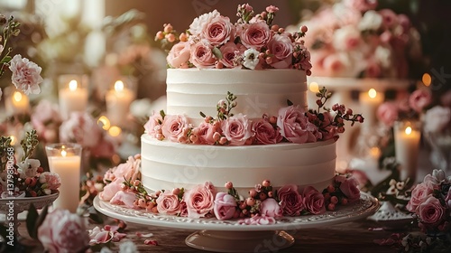 Elegant white wedding cake adorned with pink roses and glowing candles