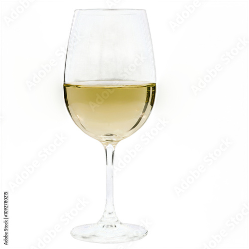 Elegant wine glass filled with light yellow white wine placed on a simple white background