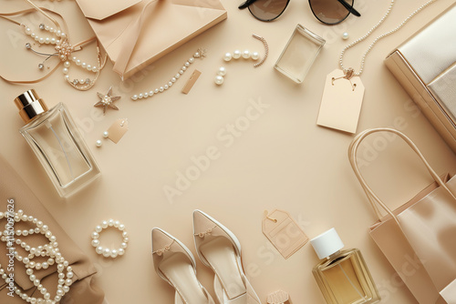 Elegant woman accessories glamour set on flat lay beige pastel background table with copy space, top view mock up