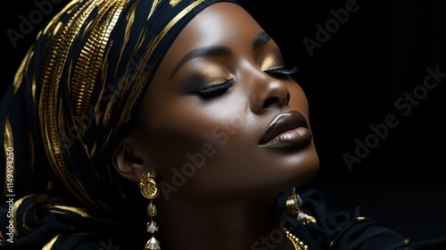 Elegant woman in gold accessories and headwrap against a dark background.