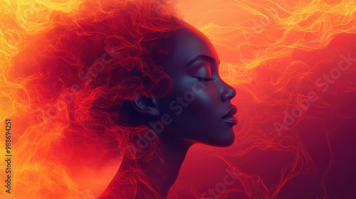 Elegant woman with afro hairstyle in a fiery red and orange digital art, flames and smoke textures symbolizing strength, power, and inner beauty