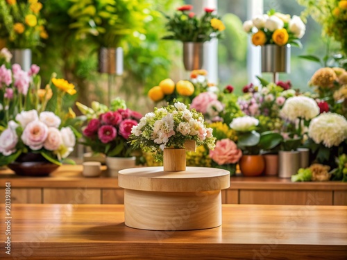 Elegant wooden pedestal showcases products on a counter top surrounded by a beautiful arrangement of fresh flowers, against a blurred and softly focused background.