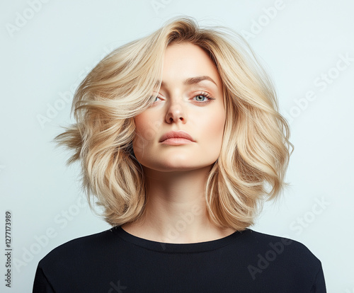 Elegante Frisur mit gewellten, blonden Haaren aus vorderseitiger Sicht