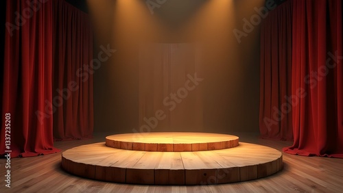 Elegantly lit stage with red curtains and circular platform for performances at a theater