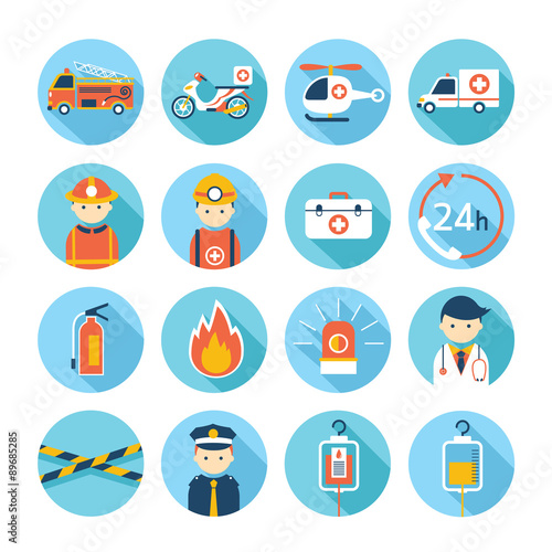 Emergency Flat Icons Set, Rescue, First Aid, Vehicle, Equipment and People