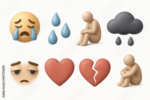 Emotional expression icons set: 3d style with crying, sadness, and heartbreak