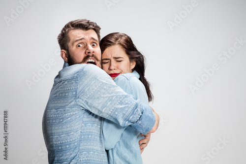 Emotional facial expression wide eyed couple, woman an man looking surprised open mouth