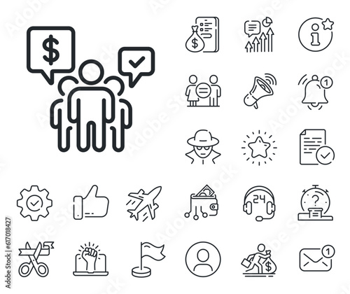 Employees chat sign. Salaryman, gender equality and alert bell outline icons. Teamwork line icon. Core value symbol. Teamwork line sign. Spy or profile placeholder icon. Online support, strike. Vector
