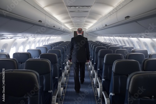 Empty Aircraft First Class with Rear View of Passenger