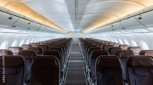 Empty Airplane Cabin With Brown Seats Aisle And Overhead Compartments Illuminated With Warm Lighting