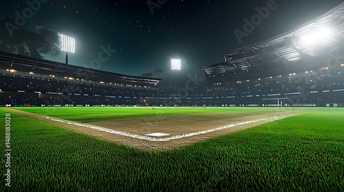 Empty Baseball Field Under Night Sky with Bright Stadium Lights