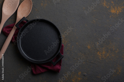 Empty cast iron pan on concrete background with wooden spoon and spatula with copy space.
