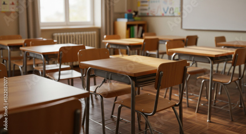 Empty Classroom: Desks, Chairs, Sunlight, Ready for Learning. School, Education, Academic Scene. Serene & Inspiring Interior Photo.