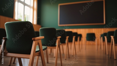 Empty classroom setting educational institution interior photography modern learning environment low angle view focused on learning spaces
